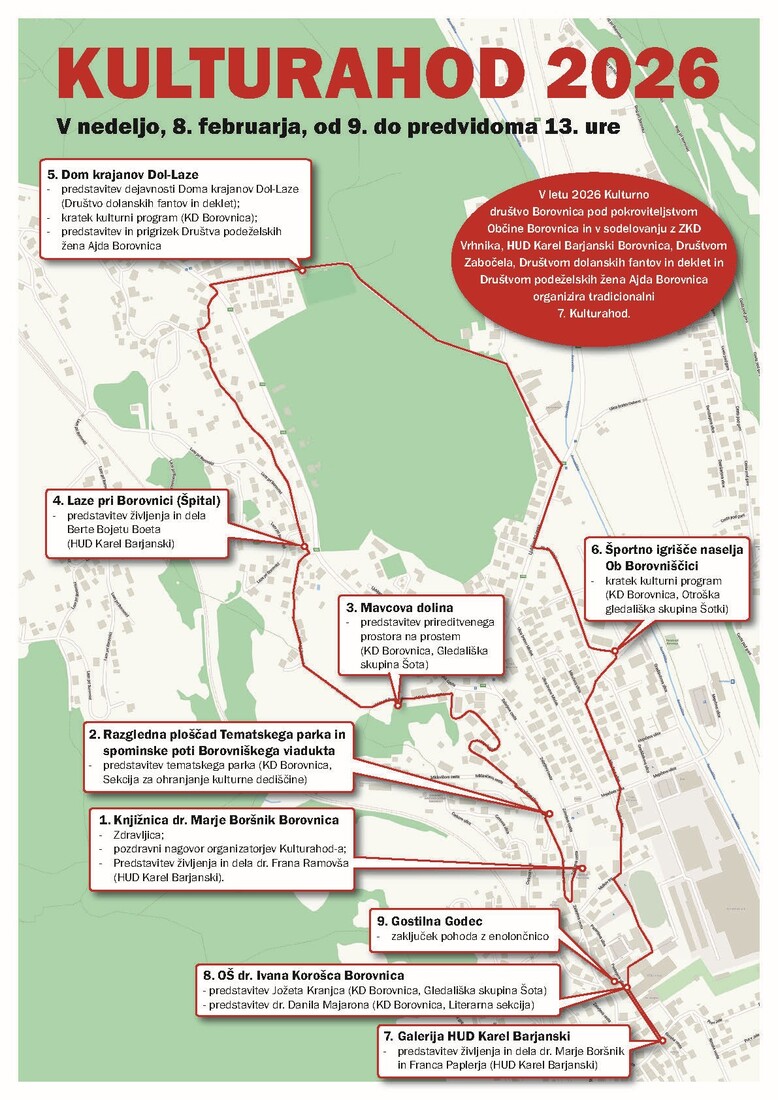 KULTURAHOD 2026 v občini Borovnica bo potekal v nedeljo, 8. 2. 2026 in se bo pričel ob 9.00, pred novo krajevno Knjižnico dr. Marje Boršnik Borovnica, na Zalarjevi cesti 19 a v Borovnici in se zaključil ob 13.00 z enolončnico v Gostilni Godec v središču Borovnice.
